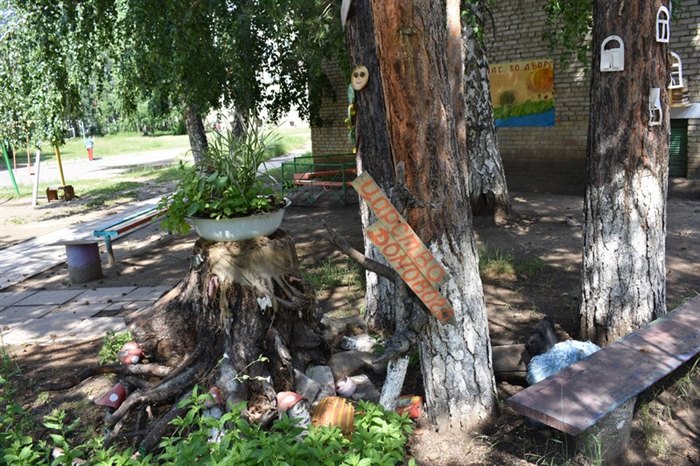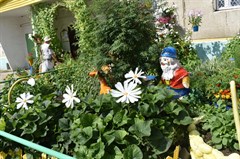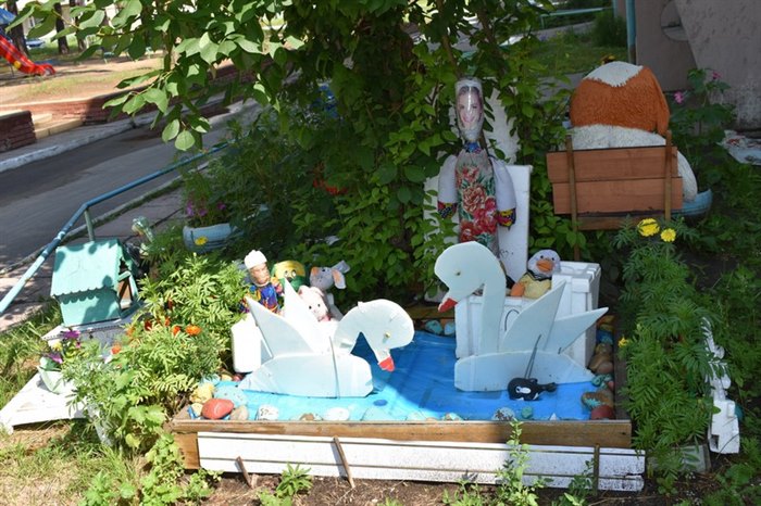 В сказочный островок превратилась клумба у дома № 9 микрорайона Строителей. Она привлекает внимание прохожих огромными яркими игрушками. В причудливые композиции из сказок их собрала Александра Васильевна Рогова. Женщина большую часть жизни работала учителем младших классов в селе. Наглядного материала для занятий в те времена нельзя было купить – все делала своими руками. Любовь к рукоделию, игрушкам, цветам осталась в душе Александры Васильевны, а ей уже 82 года! Пятый год на ее клумбе «живут» персонажи из сказок – бравый моряк в бескозырке, выполненный из бутылок, зимняя кормушка для птиц на лето превращается в зайкину избушку.