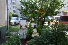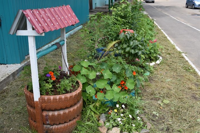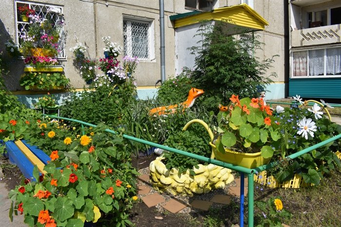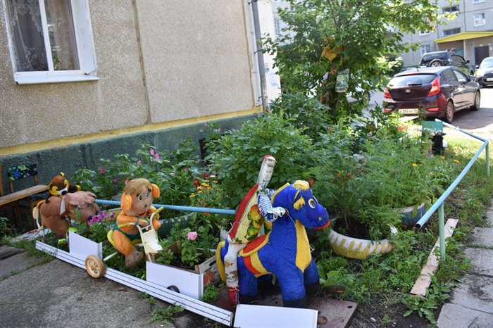 Каждый подъезд дома № 28 микрорайона Юбилейного украшен малыми формами. У одного – клумба, сооруженная в виде паровозика из ящиков, у другого – яркий колодец, у третьего – сказочный домик с котом – фантазия саянцев безгранична. Своими руками горожане создают красоту, украшающую наш Саянск.