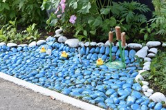 У дома № 4 микрорайона Юбилейного в этом году «разлилась синяя река». Жильцы дома ежегодно украшают свой двор, в прошлом году в городском конкурсе стали лауреатами третьей степени. А зимой вылепили из снега аж 16 фигур! Основные вдохновители и исполнители идей – Галина Васильевна Горелова, Людмила Георгиевна Максимова, Наталья Ивановна Иванова. В этом году женщины придумали стилизовать клумбу под речку. Наносили ровненьких камешков, аккуратно их уложили, покрасили яркой краской. В небольших запрудах растут камыши, плавают утки – все очень мило, ярко, свежо. Жаль, что газетный снимок не передает всю красоту. Идеи для композиций хозяйки находят в интернете, придумывают сами, перенимают опыт соседей.