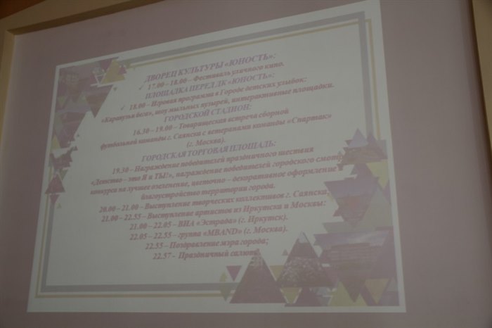 Начальник управления культуры Светлана Каплина доложила о предпринятых подготовительных мероприятиях. В частности, изготовлено 150 флагов в цвете триколора, которые разместятся на улицах города; обновлен баннер «Добро пожаловать в Саянск» и поздравительный баннер мэра на городской площади и на фасаде Дворца культуры «Юность». В ходе подготовки к мероприятию в честь празднования Дня города были проведены встречи с ответственными лицами по сбору и вывозу мусора с территории площади, органами ОВД по перекрытию дороги и обеспечению безопасности.