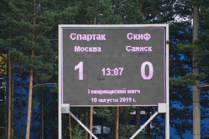 Весь первый тайм страсти кипели нешуточные, болельщики поддерживали саянцев – замирали, когда москвичи подбирались к нашим воротам и не жалели голоса, когда «скифы» направлялись к воротам «Спартака». Первый тайм закончился с равным счетом – 2:2.