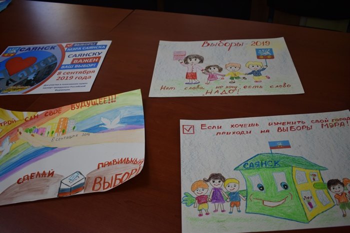 Саянская территориальная избирательная комиссия изготовила баннеры, на которых размещены лучшие работы, поступившие на конкурс рисунков-наказов кандидатам в мэры города.