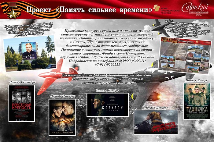 В прошлом году при участии благотворительного фонда в сквере ветеранов была сооружена мемориальная стена памяти с именами участников и героев Великой Отечественной, которые в послевоенные годы проживали в нашем городе. В рамках реализуемого проекта «Память сильнее времени» здесь же, в сквере ветеранов будут установлены уличные антивандальные стенды с информацией о подвигах городов-героев той войны и городах воинской славы. Совместно с управлением культуры будет организован показ военно-патриотических фильмов. В школах города пройдет конкурс на лучшее стихотворение военной тематики, в нем примут участие старшеклассники. Малышам же предложат поучаствовать в конкурсе рисунков на тему Великой Отечественной. Проектом предусматривается организация совместно с театральной студией при Доме детского творчества две постановки на военную тематику.