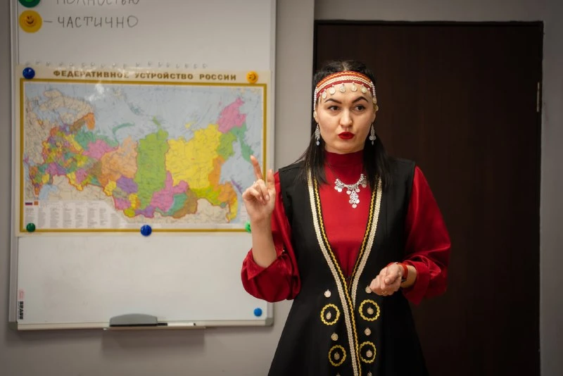 — Классные часы, которые учителя устроили для ребят в присутствии жюри, были посвящены Году единства народов России. Каждый участник раскрыл эту тему индивидуально, через призму собственного жизненного опыта, интересов. Одна из конкурсанток поделилась историей жизни своего дедушки, который принадлежал к башкирскому этносу. Свой рассказ она вела в традиционном костюме этого тюркского народа.