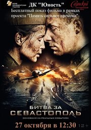 С 21 по 24 октября в 13:00 и 27 октября в 12:30 идет показ фильма "Битва за Севастополь". Это второй фильм из цикла на военно-патриотическую тему, которые показываются в ДК "Юность" бесплатно для всех желающих в рамках проекта "Память сильнее времени". Проект был выигран Саянским благотворительным фондом во втором конкурсе Фонда Президентских грантов.