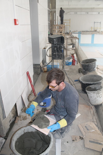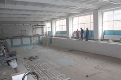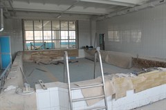 Следующий этап – бассейн «Золотая рыбка», где идет капитальный ремонт. Работы ведёт предприятие «Ново-Строй». Смонтирована новая кровля. Заменены системы отопления и вентиляции. Завершена облицовка фасада. Отремонтировано входное крыльцо, установлен пандус. Закончены работы по монтажу оконных витражей. Установлены новые двери. Закончено устройство теплых полов в чашах бассейна.