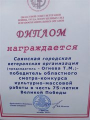 Саянская ветеранская организация ежегодно становится победителем конкурсов, проводимых областным советом ветеранов. И в этот раз председатель городского совета ветеранов Татьяна Огнева получила «диплом победителя областного смотра-конкурса культурно-массовой работы в честь 75-летия Великой Победы», а также почетную грамоту за активную общественную деятельность по развитию ветеранского движения.