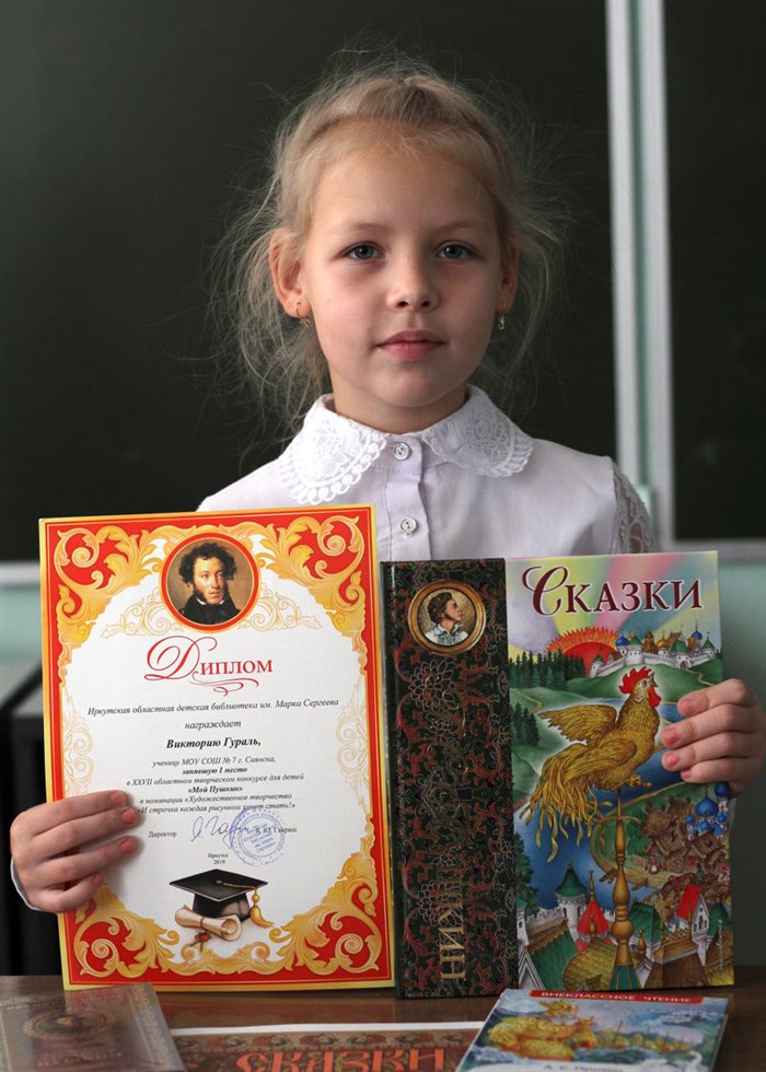 Юные саянцы готовили работы по номинациям: создание буктрейлера «Волшебство пушкинского слова», литературное творчество «Душа себя невольно выражает…» и художественное творчество «И строчка каждая рисунком хочет стать! ». В номинации художественное творчество «И строчка каждая рисунком хочет стать! » участвовало 570 рисунков. Тем приятнее, что лучшим был признан рисунок ученицы саянской школы № 7 Виктории Гураль. Второе место заняла работа Елены Матюшенко, учащейся той же школы. В числе призеров за третье место ребята из седьмой − Александра Арзамасцева, Екатерина Бродягина, София Казанцева, Вероника Ключникова, Анастасия Рженёва и гимназистка Элиза Лобанова. Юные художники получили грамоты и книги в подарок.