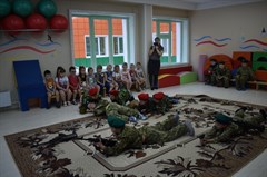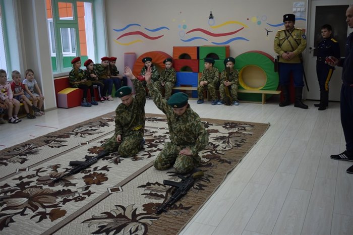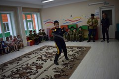 В детском саду № 23 прошло необычное мероприятие – в гости к дошкольникам пришли ребята из школы № 5, занимающиеся в военно-патриотическом отряде «Вымпел» и хуторском казачьем обществе. Юный казак под руководством атамана Александра Бондаренко показал упражнения с саблей и нагайкой. Юнармейцы вместе с педагогом Михаилом Костюковичем представили малышам показательные выступления, приурочив их к 100-летию создателя знаменитого на весь мир автомата Михаила Калашникова.