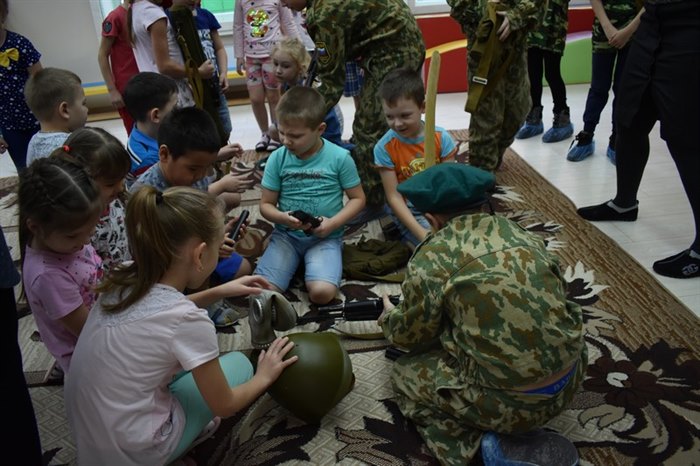 Дошколята узнали о видах современного оружия, о средствах защиты – касках и противогазах. Дошкольники смотрели во все глаза и слушали, затаив дыхание – хоть им представили макеты автоматов, пистолетов, ручного гранатомета, выглядели они как настоящие. А когда малышам разрешили потрогать и примерить военные экспонаты – восторгу их не было предела.