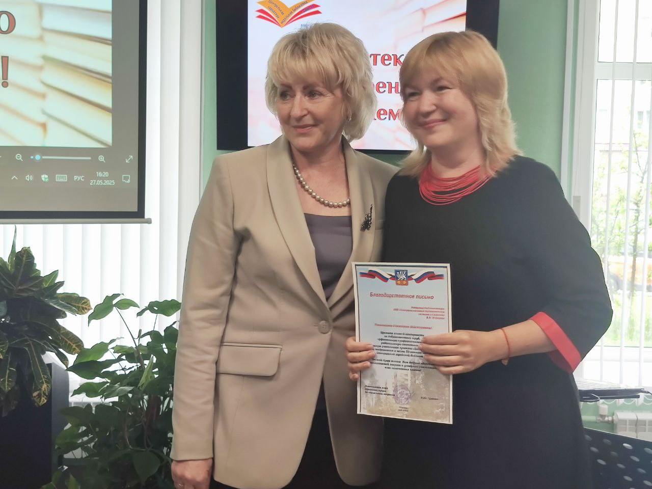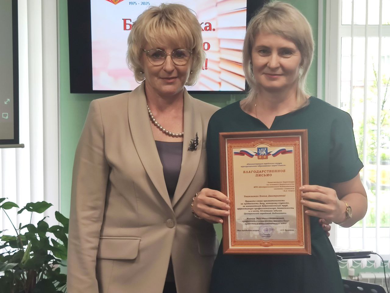 С таким замечательным событием, от имени мэра города Саянска Александра Ермакова, директора библиотеки Киру Осипову и её коллектив поздравила заместитель мэра по социальным вопросам Наталья Гузенко. Сотрудникам библиотеки за отличную работу были вручены благодарственными письмами. Почетной грамотой министра культуры Иркутской области О.Н. Полуниной была награждена заместитель директора по работе с детьми Шурикова Наталья Юрьевна.