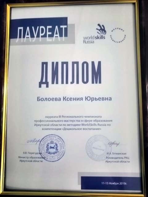 Воспитатель детского сада №19 «Росинка» Ксения Болоева стала лауреатом регионального этапа международного чемпионата профессионального мастерства по стандартам WorldSkills среди педагогов дошкольных учреждений. Ксения успешно выступила на межмуниципальном туре отборочного этапа. Став призером, она в числе 15 претендентов на победу, приняла участие в финале III регионального конкурса, который проходил 11-15 ноября в Ангарске.