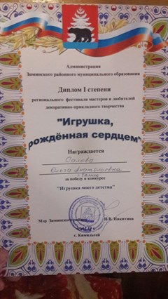 Творческое объединение «Венец мастеров» города Саянска приняло участие в седьмом региональном фестивале декоративно-прикладного творчества «Игрушка, рожденная сердцем», прошедшем в селе Кимильтей Зиминского района. Причем наши мастера выступили во всех номинациях конкурса. Они представили свои работы на выставке «Игрушечная территория», гастрономической выставке «Детское блюдо – каждому ребенку любо», а также приняли участие в конкурсе мастеров в режиме реального времени и проведении мастер-класса от «Народного мастера». По итогам конкурса Циглер Виктория награждена за участие в выставке «Игрушечная территория» и получила благодарность за проведение мастер-класса «Пластилиновая живопись». Ольга Салова награждена дипломом первой степени конкурса мастеров в режиме реального времени. Вера Верхотурова, Ольга Салова, Елена и Мария Шангины отмечены за участие в «Игрушечной территории».