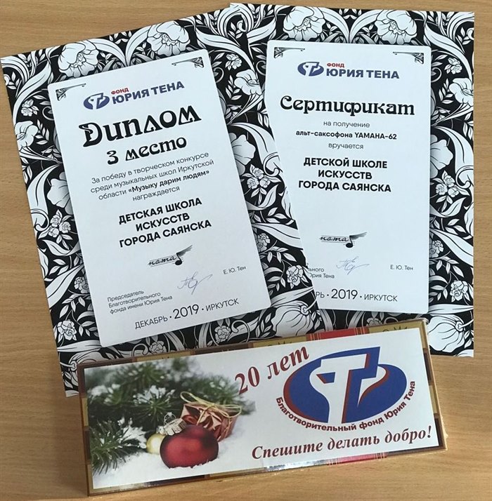 За победу в творческом конкурсе среди музыкальных школ Иркутской области «Музыку дарим людям» детская школа искусств г. Саянска стала обладателем сертификата на получение альт-саксофонаYamaha-62.
