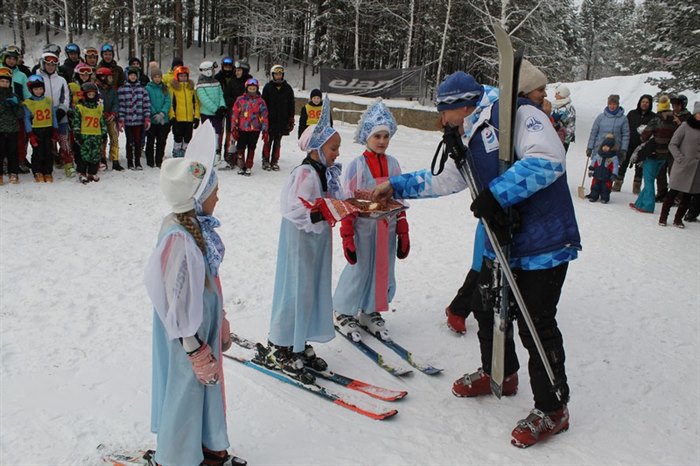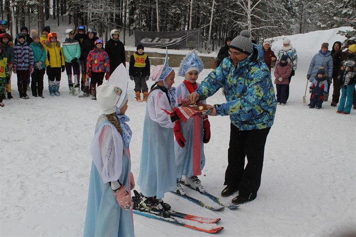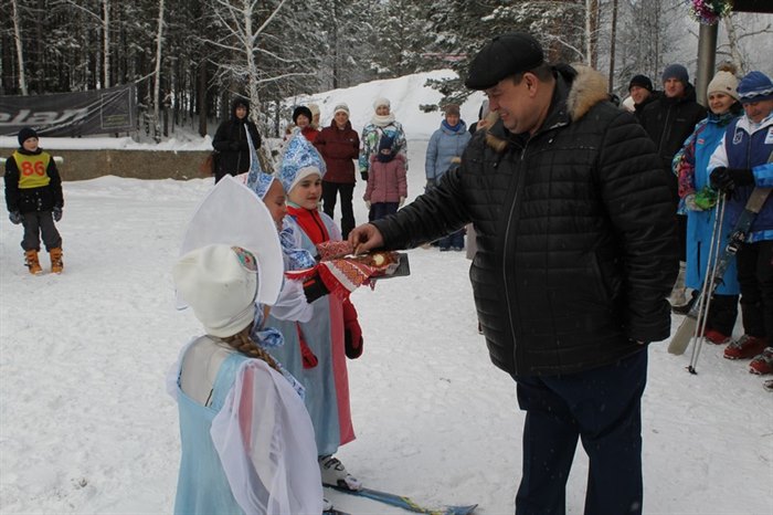Нарядные Снегурочки на лыжах преподнесли почетным гостям праздника каравай.