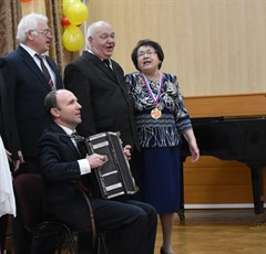 Творческие номера дарили бывшие ученики Валентины Павловны, а сейчас руководители творческих коллективов: хора мальчиков – Юрий Мурашов, хореографического ансамбля – Светлана Попова. Молодые педагоги, соратники по творчеству, активисты городского хора ветеранов «Надежда» поздравляли юбиляра.