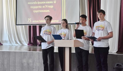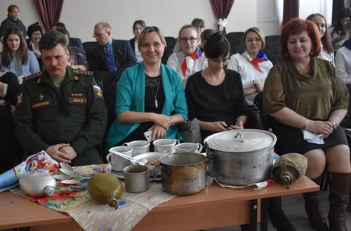 Школа № 2 провела презентацию проекта «Оружие Великой Отечественной войны». Ребята рассказали о промышленных предприятиях по производству оружия, о путях его доставки к местам сражений. Показали виды оружия, в завершение провели небольшую викторину на знание видов вооружения тех лет. Гимназия готовила экспозицию по проекту «Быт солдата» или «Перед боем». Они представили реконструкцию солдатского бивуака, в которой предложили экскурсантам выполнить несколько заданий: написать письмо и свернуть его в форме фронтового треугольника; перемотать портянки и подшить подворотничок; свернуть шинель, спеть песню.