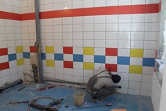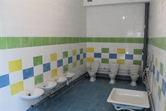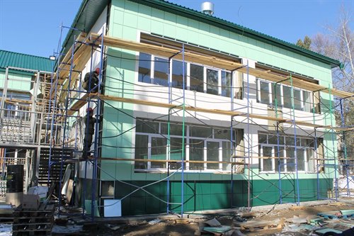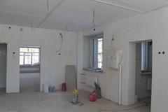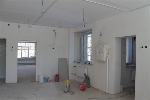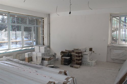 По информации Ольги Знаменской, во внутренних помещениях здания выполняется чистовая отделка, шлифуются и шпаклюются стены и потолки. На втором этаже производится финишная заливка полов, выкрашены потолки. Установлены противопожарные двери в теплоузе, по выходам на эвакуационные лестницы. Завершена облицовка стен керамической плиткой на пищеблоке, в медкабинетах, комнатах уборочного инвентаря и туалетах для сотрудников. Отделка детских туалетов тоже практически готова. Проводятся инженерные сантехнические работы в детских туалетах, прокладываются канализационные трубы и трубы водоснабжения, началась установка санфаянса. Введен в эксплуатацию подогрев полов в группах на первом этаже. По лестничным маршам идут подготовительные работы для укладки керамогранита. Выполнены замеры для установки стальных перил по внутренним лестничным маршам. Ведутся работы по установке алюминиевых дверей внутри здания, согласован монтажный лист.