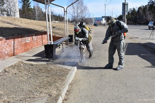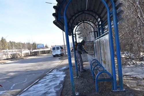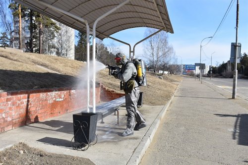 Городская дорожная служба совместно с МЧС проводят дезинфекцию остановочных павильонов. Городская администрация закупила дезинфицирующие средства, сотрудники МЧС в защитных костюмах с помощью специального оборудования обработали все остановки. Тщательно проливались скамейки, стены, стойки павильонов и участки асфальта, прилегающие к остановкам.