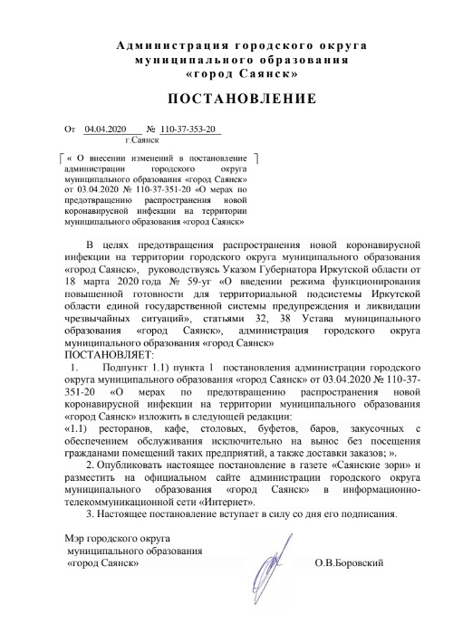 Внесены изменения в постановление администрации Саянска № 110-37-351-20 от 3 апреля, регламентирующее работу предприятий торговли непродовольственными товарами, общепита и услуг до 30 апреля. Изменения касаются объектов общественного питания – ресторанов, кафе, столовых, буфетов, баров, закусочных, залы которых решено пока не открывать для посетителей. Обслуживание, в соответствии с постановлением от 4 апреля, должно быть организовано исключительно на вынос, без посещения гражданами помещений таких предприятий, а также в формате доставки заказов.