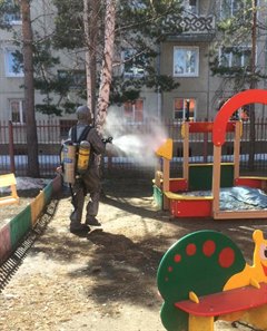 Саянская дорожная служба совместно с сотрудниками МЧС проводит обработку дезинфицирующим раствором территорий детских садов города, включая детские игровые площадки, малые формы, веранды.