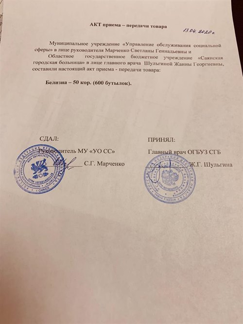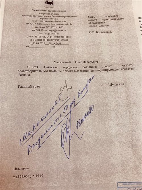 Из 100 коробок «Белизны», приобретенной у градообразующего предприятия, город выделил на безвозмездной основе Саянской городской больнице 50 коробок, для проведения дезинфекции.