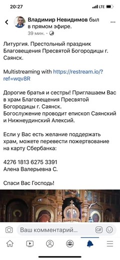 Несмотря на наши просьбы и разговор с Владыкой о том, чтобы люди молились дома и ограничить доступ в храм, звучали призывы и приглашения на службу верующих во время празднования праздника Благовещения. До сих пор службы проходят с прихожанами. Священнослужители! Если вы себя не жалеете, пожалейте прихожан.