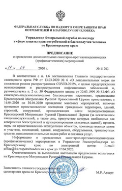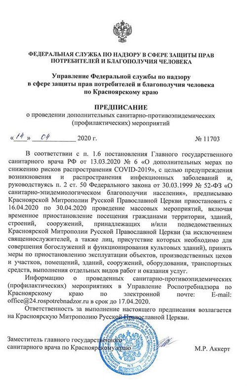 Управление федеральной службы по надзору в сфере защиты прав потребителей и благополучия человека по Красноярскому краю издало предписание Красноярской Митрополии приостановить с 16 по 30 апреля проведение массовых мероприятий, включая временное приостановление посещения гражданами территории, зданий, строений, сооружений, подведомственных Митрополии. Считаю это правильным решением, которые нужно распространить и на другие регионы.
