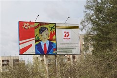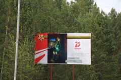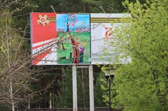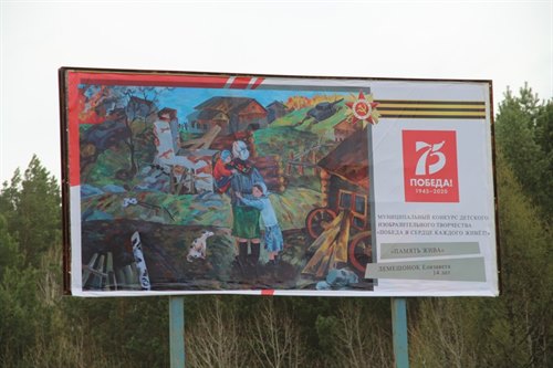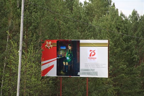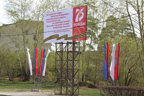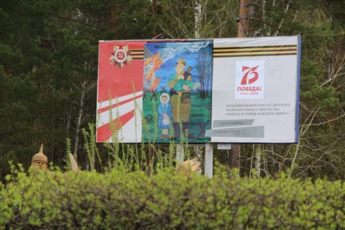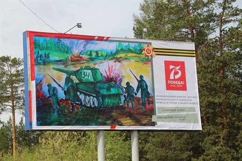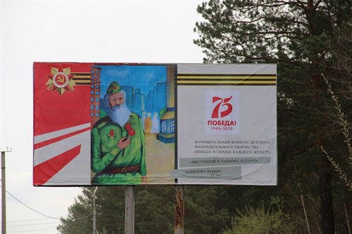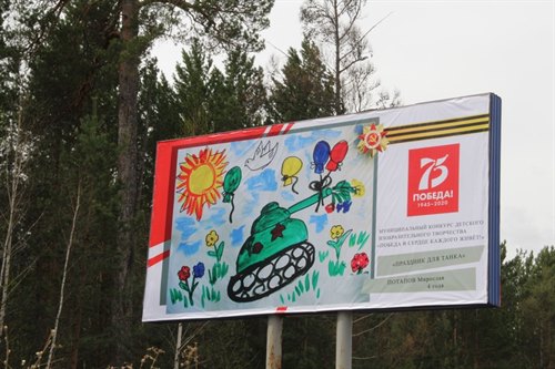 Все уличные баннеры оформлены в теме победной тематики. В Саянске прошел конкурс детского рисунка и лучшие работы ребят размещены на баннерах.
