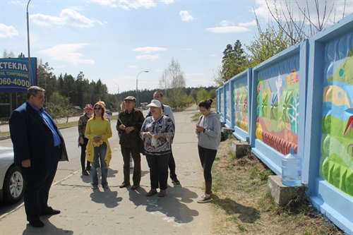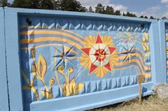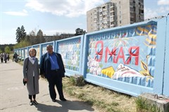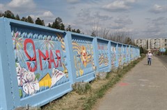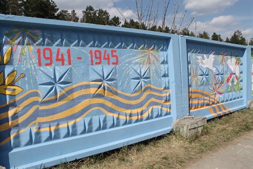 На въезде в Саянск педагоги детской школы искусств художественно оформили стену, обрамляющую один из объектов. Тема – 75-летие Великой Победы и 50-летие города Саянска.