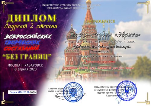 Конкурс «Без границ» организован международным арт-центром «Наследие» при поддержке Министерства культуры РФ и Министерством просвещения РФ. Состязания проводятся с целью выявления и поддержки наиболее талантливых и ярких творческих людей разного возраста. Участники проекта представляют свое мастерство в разных направлениях: музыкальное творчество, театральное и цирковое искусство, хореография, изобразительное искусство и декоративно-прикладное творчество, фотография. Саянцы впервые участвовали в этом проекте и довольно успешно – спектакли «Эврики» стали лауреатами второй степени. Яна Александровна получила благодарственное письмо от оргкомитета за высокий профессионализм и кропотливый труд в подготовке к участию в проекте.