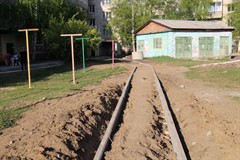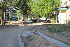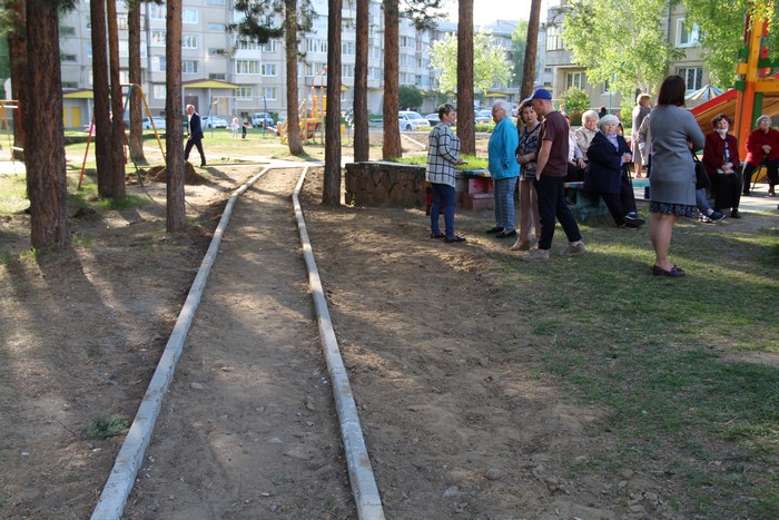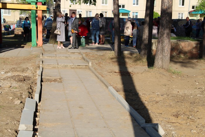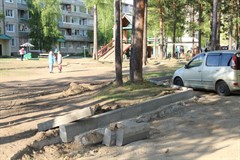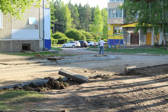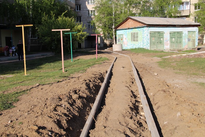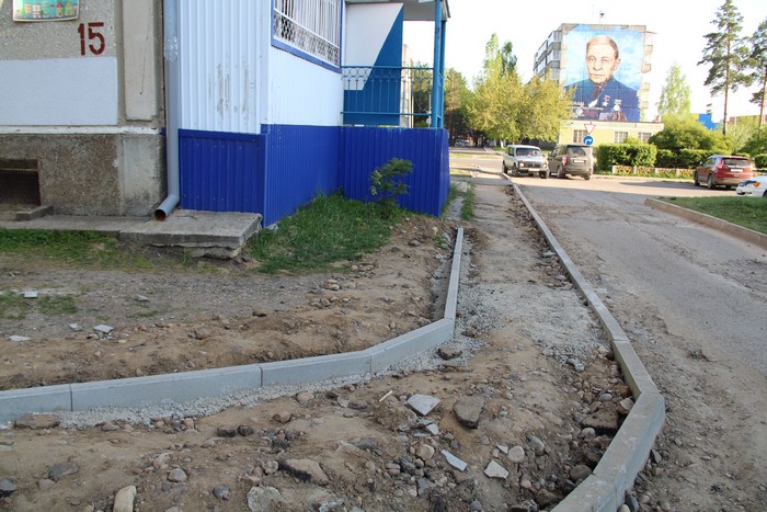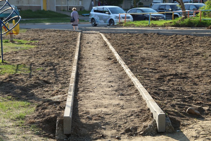И вот наконец-то работа началась. С учетом неровного рельефа, строители приступили к планировке территории, прокладке пешеходных дорожек внутри двора, причем, именно там, где жители привыкли ходить и за много лет протоптали тропинки. Однако некоторым жителям показалось, что поребрик, установленный на дорожках, установлен слишком высоко и людям будет трудно ходить по таким дорожкам.