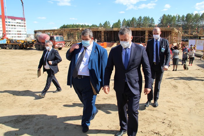Затем делегация направилась на городские строительные площадки. Первым объектом стала возводимая в микрорайоне Ленинградском общеобразовательная школа. Как сообщил коммерческий директор фирмы-подрядчика – иркутской компании СПМК-7, депутат Законодательного собрания Антон Красноштанов, строительство было начато в прошлом году. Однако бетон, который выпускают предприятия на ближайших территориях, не соответствует требуемому качеству.