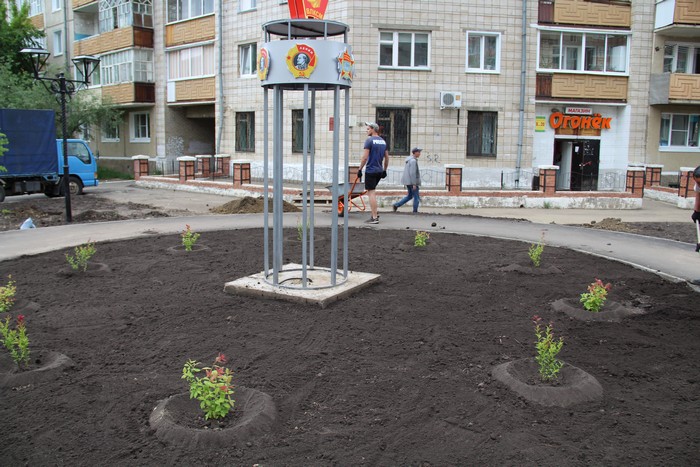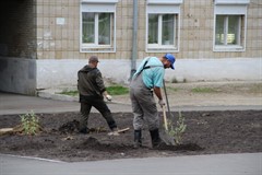 Рабочие компании «Техдорстрой» при ощутимой поддержке саянской управляющей компании «Уют», оформляют газоны, выравнивают поверхность, высаживают приготовленные растения.