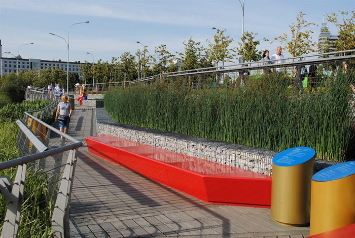 Юлия Колькина особо отметила лесной массив, где максимально сохранены грунтовые тропинки, – парк активно используется спортсменами. Для развития спортивных маршрутов разработана система навигации. В парке все продумано до мелочей. Над проектом работали специалисты г. Казани ООО «Архитектурный десант» и снова «Проектная группа 8». В Горкинско-Ометьевском лесу особо понравился контейнерный центр Cube. На базе Cube функционирует площадка для мероприятий выходного дня – лекций, мастер-классов и ярмарок. Там же находится павильон с интерактивной выставкой, в рамках глобальной стратегии Coca-Cola «Мир без отходов», где представлена продукция из вторсырья – лежаки, стулья.