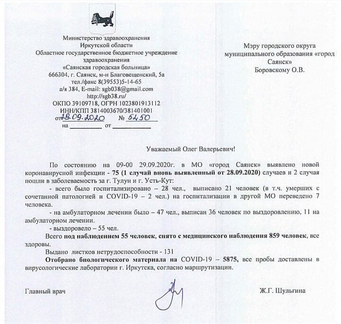 По состоянию на 29.09.2020 Подтверждённых случаев инфицирования 19076 (+87), в том числе: Госпитализировано 1043 (+21) Лечатся амбулаторно 658(+17) Выздоровело 17061 (+81) Умерло 226 (+2) Умерло от иных, не связанных с COVID-19, заболеваний 88