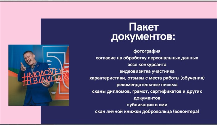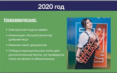 Конкурс проводится по 29 номинациям. Заявки на участие в конкурсе в 2020 году подают конкурсанты самостоятельно, в личном кабинете автоматизированной информационной системы (АИС) на сайте www.ais.fadm.gov.ru до 30 октября 2020 года. Участие в муниципальном этапе конкурса добавляет конкурсанту на областном уровне 0,5 балла; победа – 1 балл. Для участия в муниципальном этапе следует направить до 26 октября 2020 года отсканированный пакет документов в отдел по молодежной политике администрации Саянска на эл. почту molodsayansk@mail.ru.