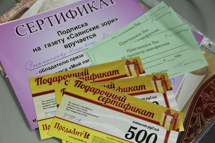Награждение победителей конкурса состоялось в читальном зале городской библиотеки 16 октября. В качестве призов победители получили наборы для игр в бадминтон, сертификаты магазина «ПродалитЪ», билеты в кино. Призы были предоставлены управлением культуры города и отделом по физической культуре, спорту и молодежной политике. Специальный приз – подписка на газету «Саянские зори» досталась обладателям приза зрительских симпатий – Станиславу Минаеву и Бэлле Ращупкиной.
