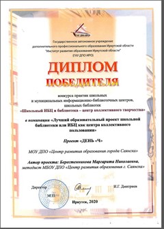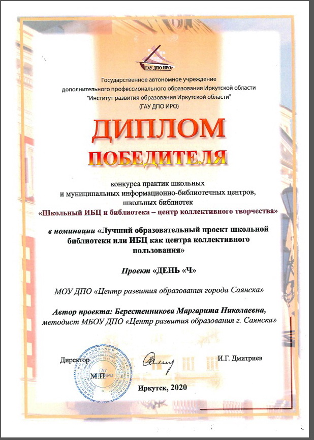 Методист Центра развития образования Маргарита Берестенникова стала победителем регионального конкурса практик школьных и муниципальных информационно-библиотечных центров, школьных библиотек с образовательным проектом «ДЕНЬ «Ч».