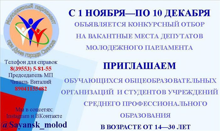 В целях привлечения молодежи к участию в деятельности муниципальных органов власти, развития молодежного парламентаризма, с 1 ноября по 10 декабря 2020 года проводится конкурсный отбор на вакантные места депутатов Молодежного парламента при Думе города Саянска.