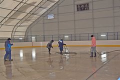 Создание хорошего катка – это длительный и довольно трудоемкий процесс. Как рассказал заведующий спортивным сооружением Антон Сюткин, заливка создается в несколько этапов путем постепенного наращивания толщины льда. Специальное приспособление позволяет подавать воду равномерно, чтобы не образовывались воздушные впадины и мешки. Нужно определенное время чтобы каждому слою затвердеть. При достижении нужной высоты льда, сотрудники спортивной школы откорректируют поверхность покрытия и отшлифуют. Одновременно с заливкой льда в помещении крытого корта ведется монтаж видеонаблюдения, пожарной сигнализации.