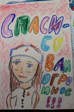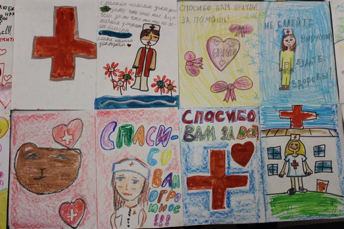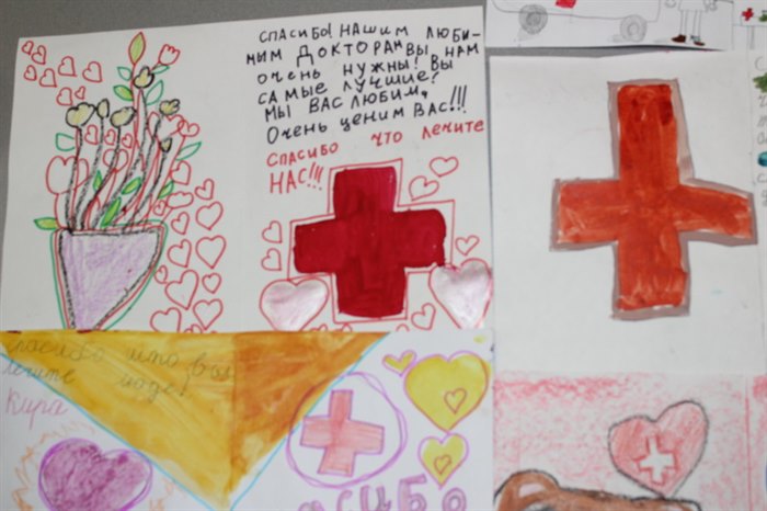 На ярких рисунках ребята старательно выводят слова благодарности докторам. И пусть некоторые слова выходят с ошибками, что придает особую трогательность работам малышей, недавно севших за школьные парты, детские творения пропитаны большим уважением к медицинским работникам, верой в победу над вирусом. Об этом они и рассказывают.