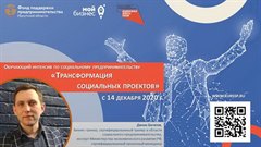 спикер: Денис Богатов, бизнес-тренер, сертифицированный тренер в области социального предпринимательства, эксперт Министерства экономического развития РФ, сертифицированный проектный менеджер, опыт сопровождения проектов социальных предпринимателей более 7 лет, сооснователь Всероссийского Конкурса «Лучший социальный проект года», эксперт федеральных программ и институтов развития («Деловая среда», «Мой бизнес», «Агентство стратегических инициатив»), автор образовательных программ и методики оценки качества деятельности организации.