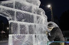 Сегодня бригада мастеров-резчиков под руководством мастера из Байкальска Андрея Пылюха завершает строительство ледового городка, посвященного в этом году теме Байкала. Последние штрихи мастера наносят при свете прожекторов.