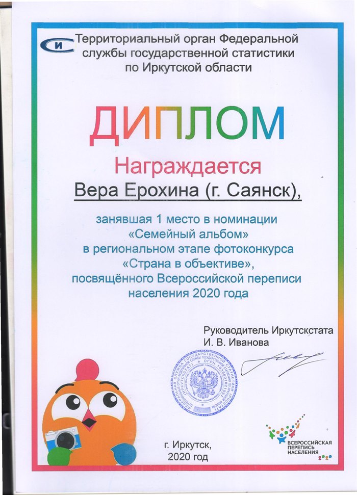 Семейная фотография принесла победу Вере Ерохиной − саянской участнице регионального этапа Всероссийского конкурса «Страна в объективе», посвященного предстоящей переписи населения. Всего на региональный конкурс поступило 72 работы, пять из которых были присланы из Саянска.