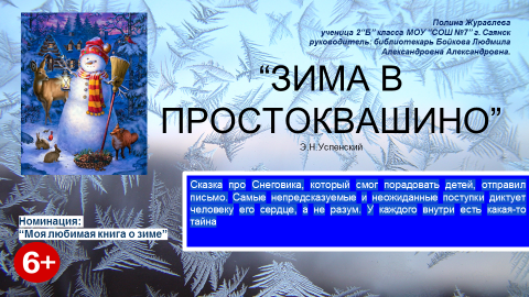 Руководитель проекта Светлана Орлова, педагог-библиотекарь школы № 2 города Лысьвы обратилась к коллегам со словами: «Дорогие читатели! В холодные зимние вечера особенно приятно закутаться в теплый плед и погрузиться в чтение. А у вас есть любимые книги, которые вы перечитываете зимой? Расскажите о них всем!» и школы Саянска поддержали проект, представив более 22 отзывов о своих любимых книгах о зиме.