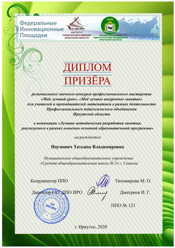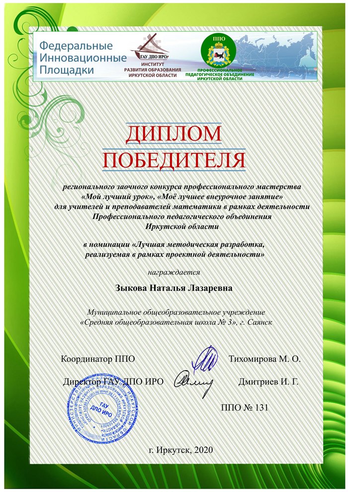 При содействии Центра развития образования девять учителей математики саянских школ стали участниками регионального этапа конкурса профессионального мастерства «Мой лучший урок» и «Мое лучшее внеурочное занятие», организатором которого выступило сетевое предметное сообщество «Математика» профессионального педагогического объединения Иркутской области при поддержке регионального института развития образования.