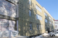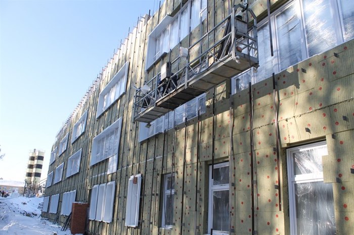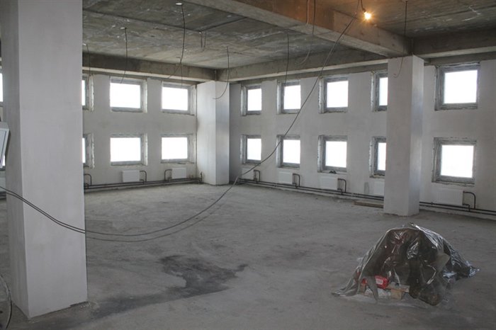 Возведены все основные конструктивные элементы здания. Ведутся монтажные работы внутренних систем электро-, водоснабжения, канализации, вентиляции, отопления, слаботочных систем. Ведется утепление фасада первого, второго, третьего и пятого блоков. Идет внутренняя отделка помещений, в них уже запущено отопление. Ведется установка оконных и витражных систем.