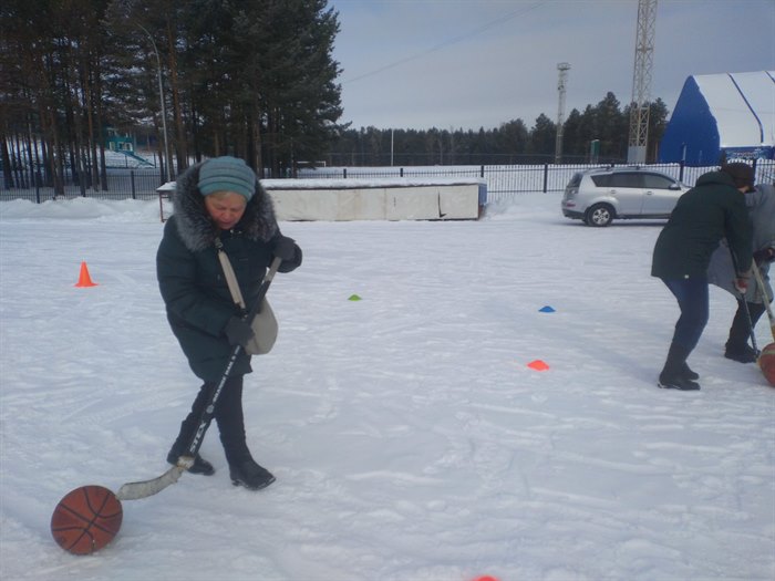 Активистки групп здоровья соревновались в веселых зимних эстафетах, гоняя хоккейной клюшкой баскетбольный мяч, и выполняя другие упражнения на координацию движений и скорость.