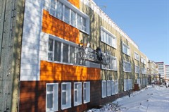 Новая школа в микрорайоне Ленинградском преображается на глазах. Подрядчик – СПМК-7 – уже приступил к облицовке фасада на первом-втором блоках.